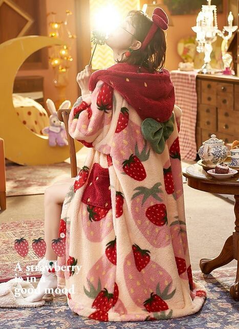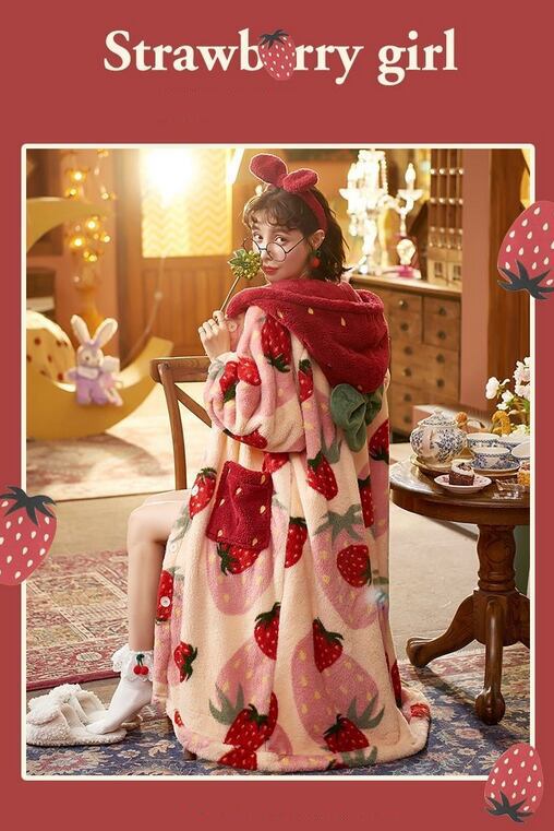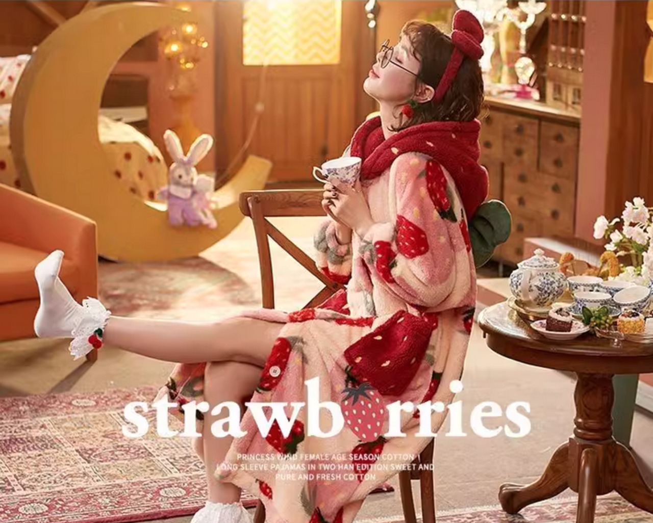 [暖かい❣単品]ストロベリーパジャマ ふわふわ苺パジャマ 寝巻き ホームウェア フード付き 寝間着 部屋着 コスチューム コスプレ衣装 秋冬用 暖かい 誕生日 新年 プレゼント