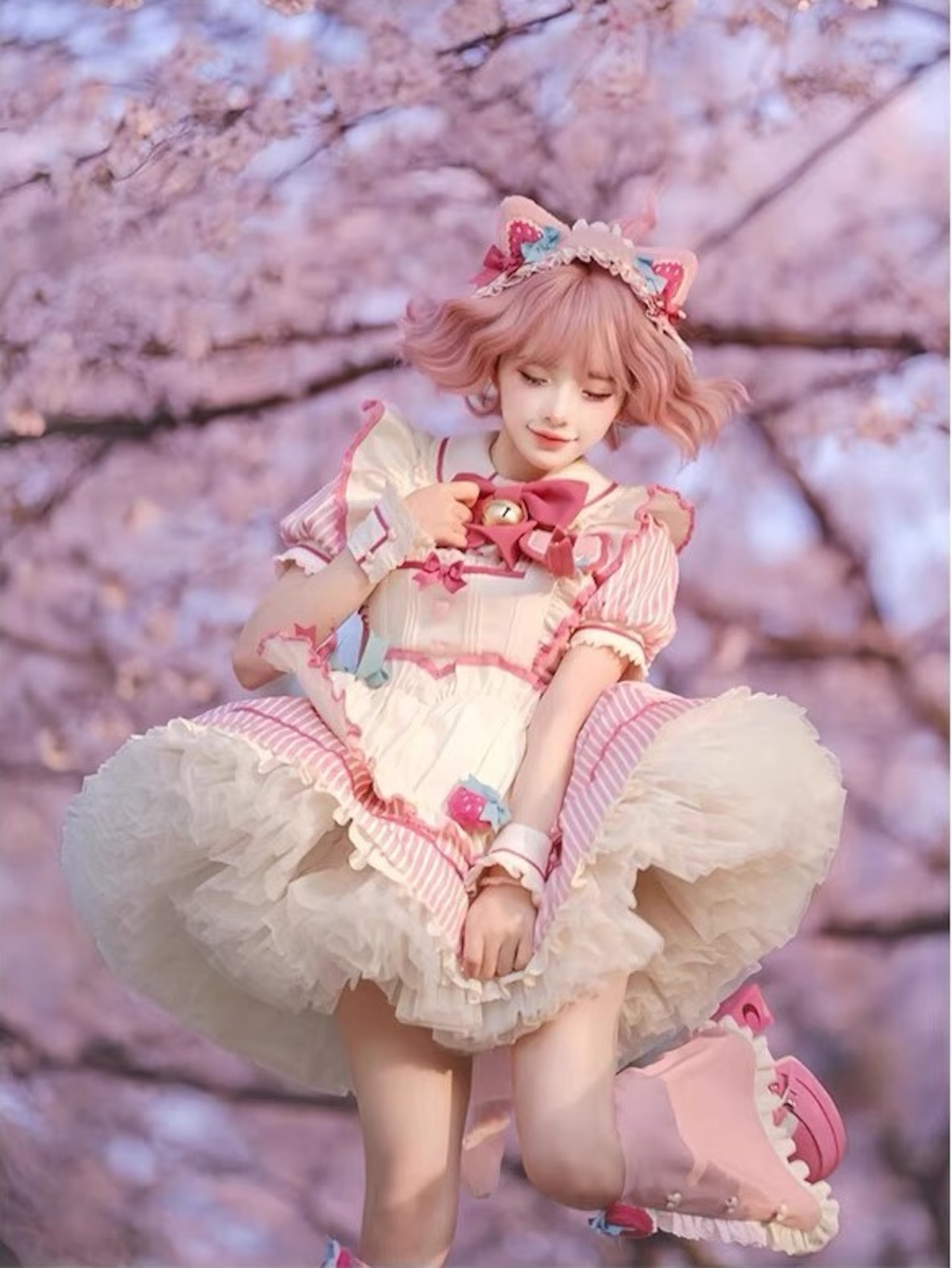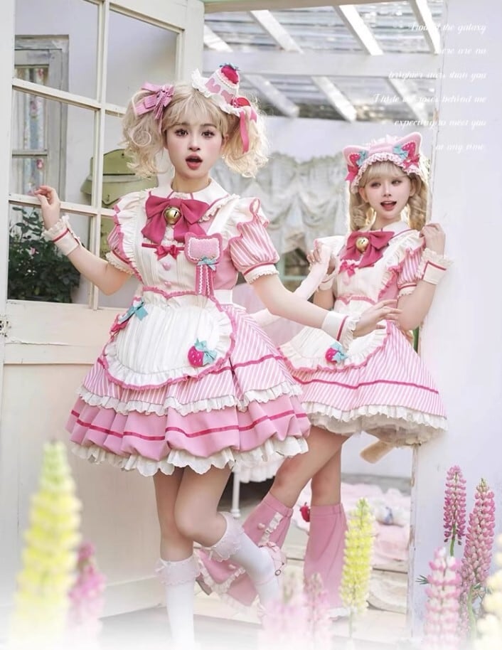 [予約商品A,Bタイプ]OP+エプロンセット-イチゴストライプロリィタメイドワンピース