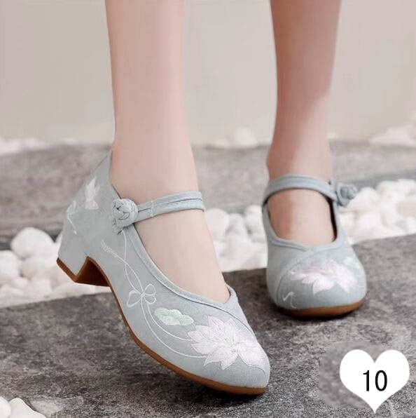 チャイナ プリント 中華風 茶 ドレス シューズ レトロ スタイル 漢服 女性 厚手 ヒール 刺繍