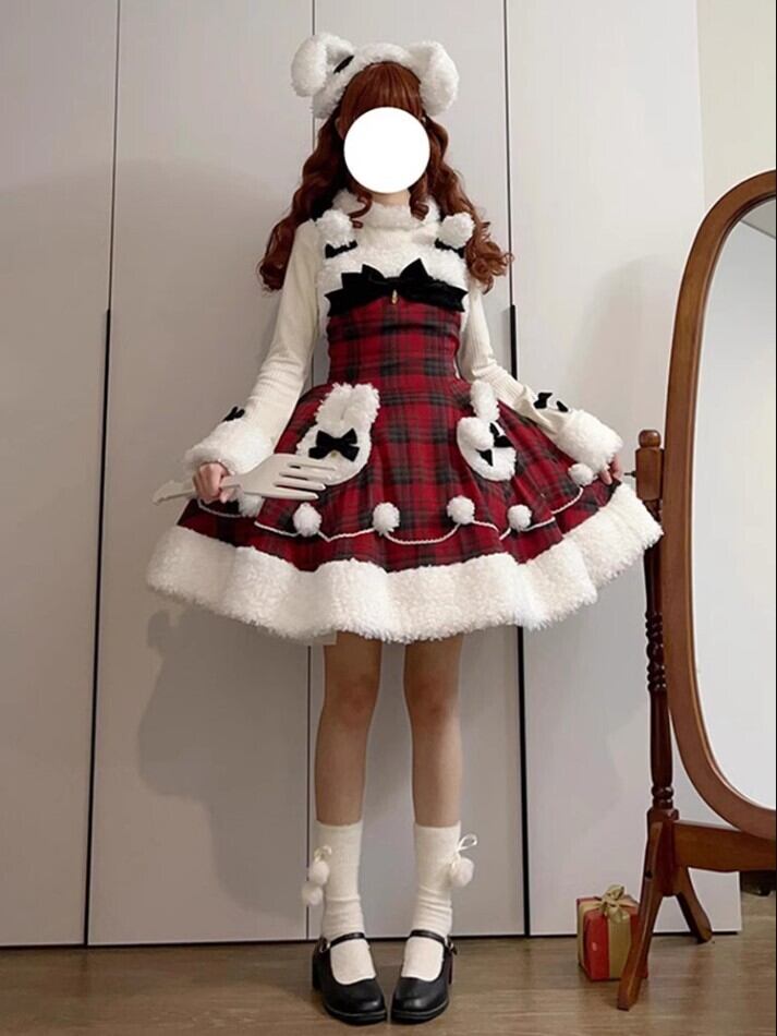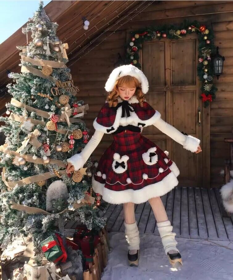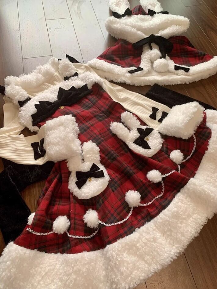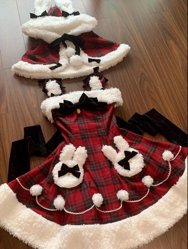 [3点セット]フード付きうさ耳ケープ クリスマスチェックロリィタジャンパースカート