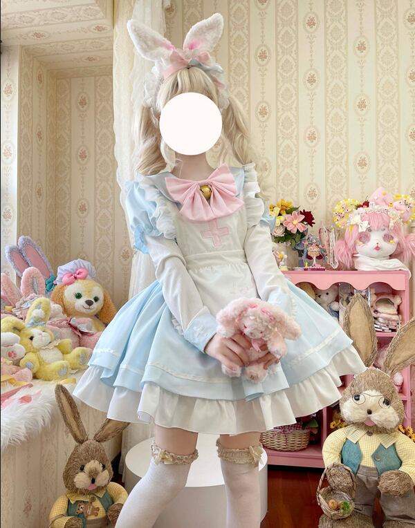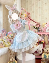 メイド服(尻尾付き)+長袖(取り外し可能)+うさ耳カチューシャ+パニエ